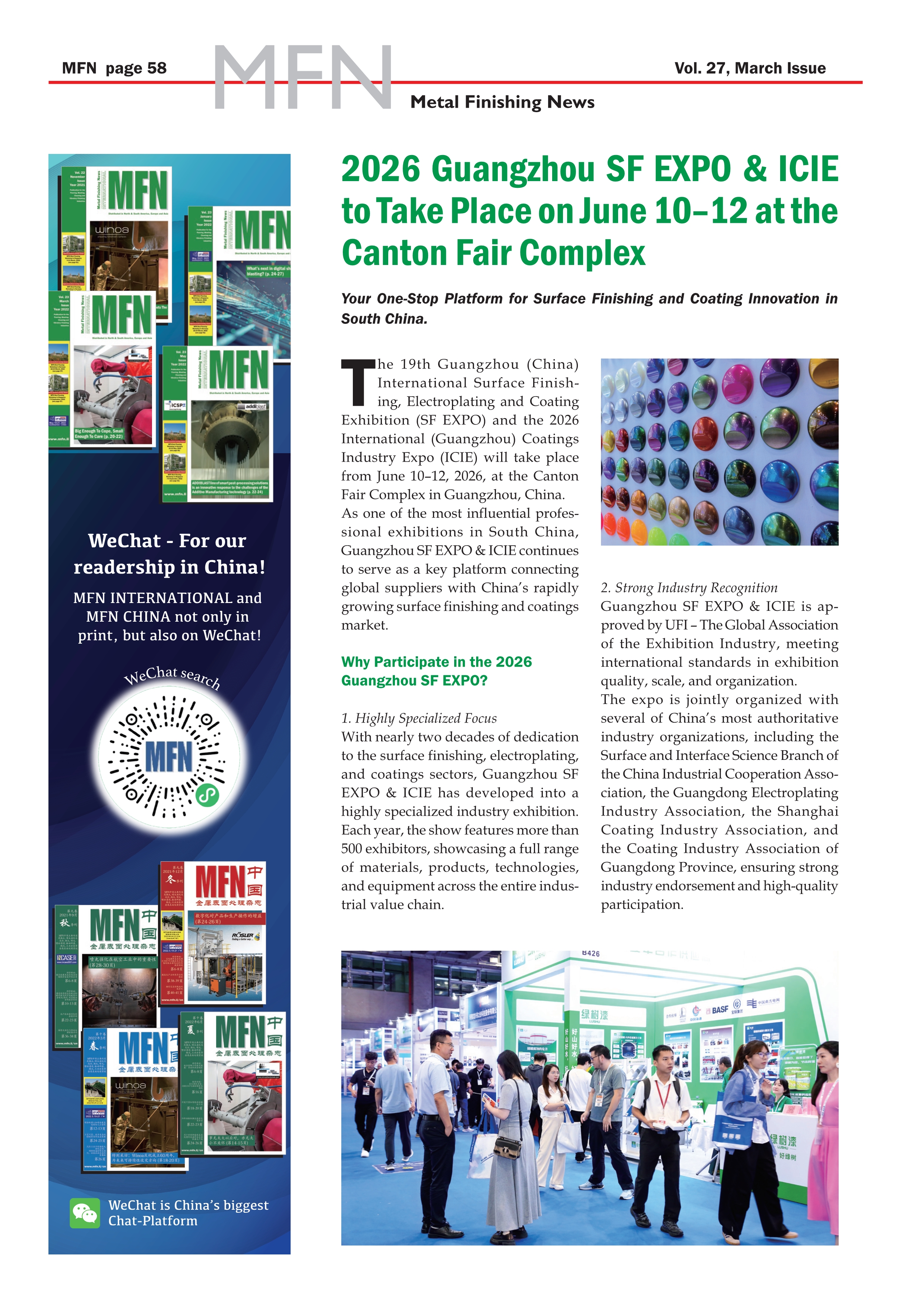 The March issue of MFN International has published exhibition news about The 19th Guangzhou (China) International Surface Finishing, Electroplating and Coating Exhibition (SF EXPO) and 2026 International (Guangzhou) Coatings Industry Expo (ICIE)