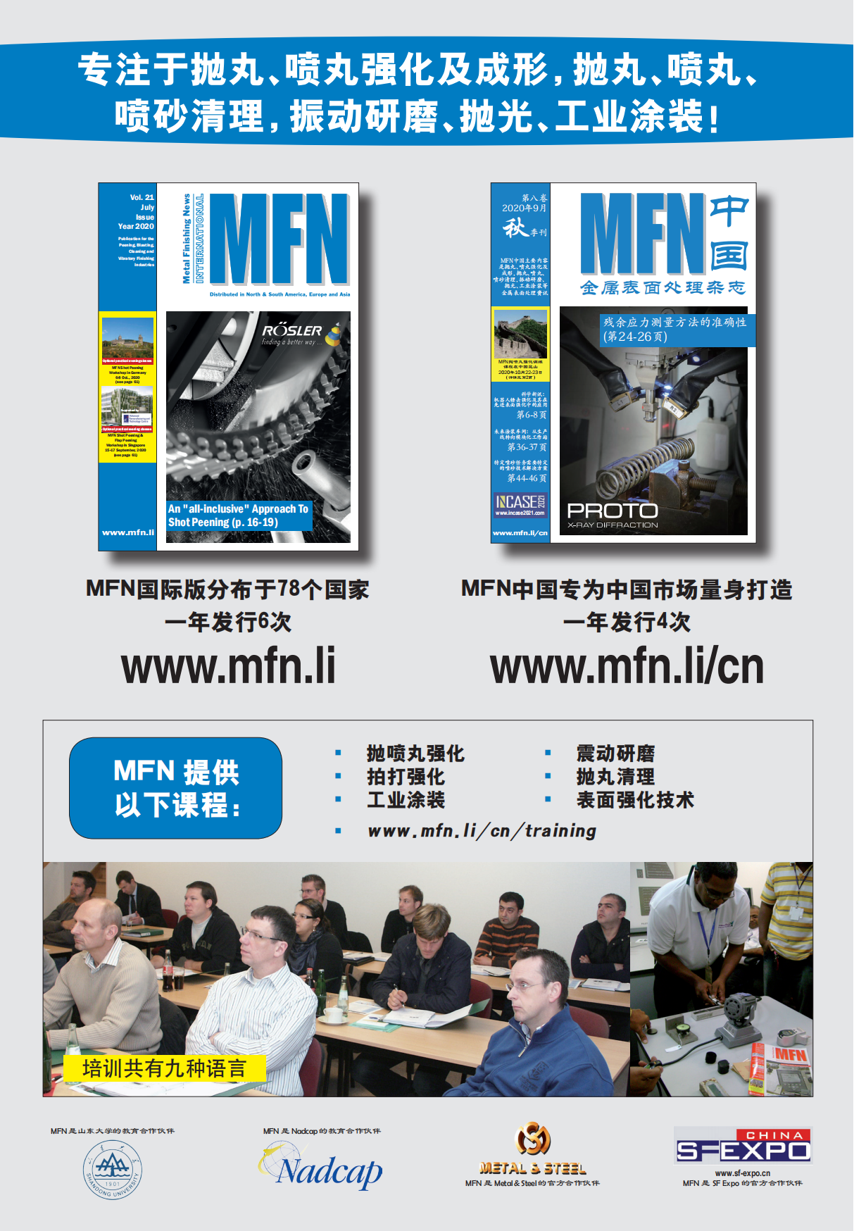 MFN (Metal Finishing News) is an international print magazine specialized in peening, blasting, mass finishing and cleaning. The publication is distributed to nearly 78 countries. MFN’s education division teaches different processes or offers consulting around the globe.