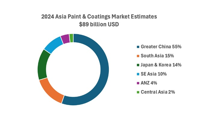 亚洲油漆和涂料市场的总市场规模估计为283亿升和894亿美元。市场由中国主导。尽管中国的增长速度不如前几年那么快,但它仍然是世界上最大的油漆和涂料市场。南亚(主要是印度)和日本和韩国是其次最大的地区。